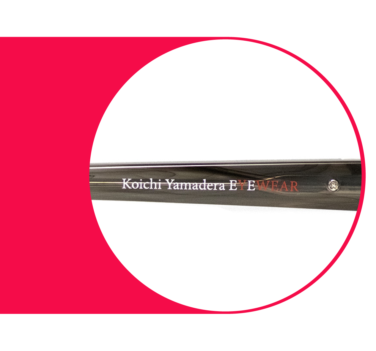 テンプル内側には、『Koichi Yamadera EYEWEAR』の印字がされており、YとWEARが赤い印字になっているのは山寺宏一のアイデアの一つです。