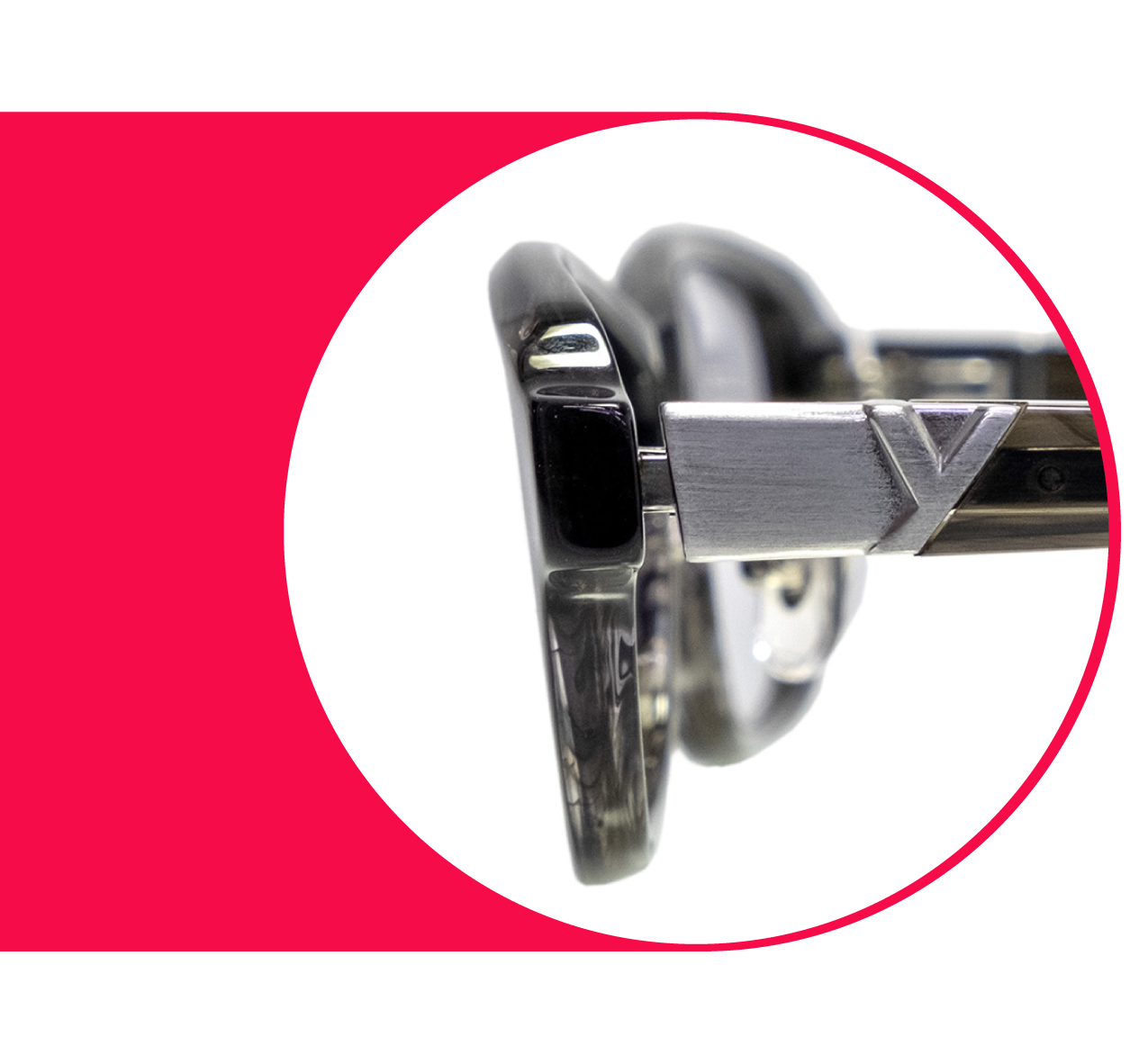 フロント(レンズが入る部分)とテンプル(耳にかかる部分)をつなぐ金具にはさりげなく山寺宏一のYをデザインしています。