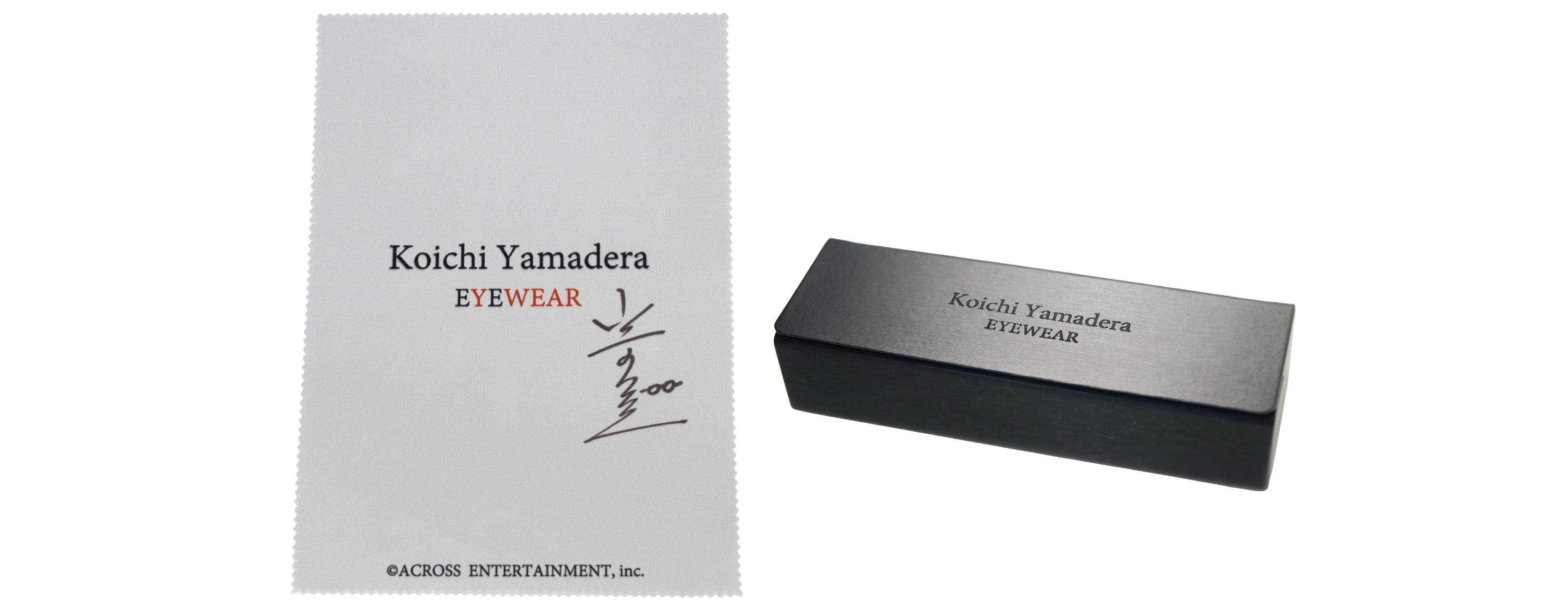 140mm×200mmのオリジナルメガネ拭き。山寺宏一のサインプリント入りです。ロゴが入った160mm×50mm×36mmのオリジナルケース。